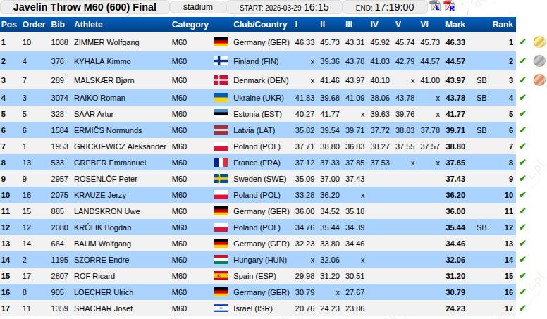 Nur wenige Wochen nach seinem Deutschen Meistertitel trat Wolfgang Zimmer vom SV Freistett zu den Europameisterschaften im Speerwurf an. Das polnische Torun an der Weichsel bietet nicht nur einen touristisch interessanten Ort mit einer zum Weltkulturerbe zugerechneten Altstadt, sondern war auch Austragungsstätte der EM der Masters. Wolfgang Zimmer war bereits vor dem Wettkampf zum Favoritenkreis der Speerwerfer in der Klasse der Masters M 60 gerechnet und konnte vor Ort auch belegen, dass diese Vorgabe berechtigt war. Im Wettbewerb der 17 Teilnehmer aus ganz Europa eröffnete er seinen Wettkampf gleich mit 46,33 m und lag damit bereits im ersten Durchgang in Führung. Diese Position gab der Athlet des SV Freistett dann auch nicht mehr ab und konnte sich bis zum letzten seiner 6 Würfe erfolgreich gegen alle Konkurrenten behaupten. Insgesamt 6 gültige Würfe und immer nah an der Eröffnungsweite ließen seine Mitbewerber erfolglos ankämpfen. Gefolgt von Kimmo Kyhälä aus Finnland (44,57 m) und Bjorn Malskaer aus Dänemark (43,97 m) wurde Wolfgang Zimmer souverän Europameister. Dass der drittplatzierte Däne dabei noch eine neue Saisonbestleistung erreichte, belegt die überragende Wurfleistung des Athleten aus dem Hanauerland, der aufgrund der nicht ganz günstigen Bedingungen sogar noch rund drei Meter unter seiner Bestleistung blieb. Doch die Saison ist noch jung und Wolfgang Zimmer hofft, dass er in diesem Jahr noch weitere Wettkämpfe nicht nur im Vereinstrikot, sondern auch wieder im deutschen Nationaltrikot bestreiten kann.